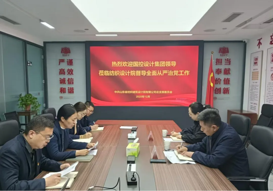 12月4日,山東省國控設(shè)計(jì)集團(tuán)有限公司黨委副書記、董事、總經(jīng)理王風(fēng)光一行到紡織設(shè)計(jì)院開展落實(shí)全面從嚴(yán)治黨主體責(zé)任情況督導(dǎo)調(diào)研,并全程列席指導(dǎo)紡織設(shè)計(jì)院黨總支會議。